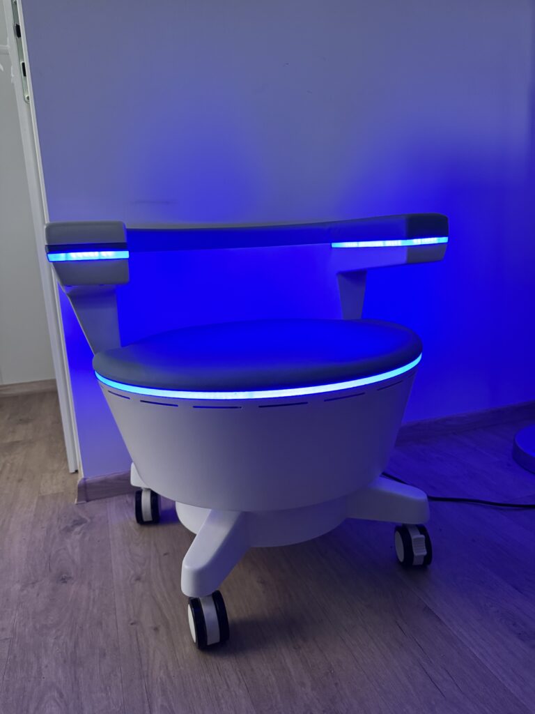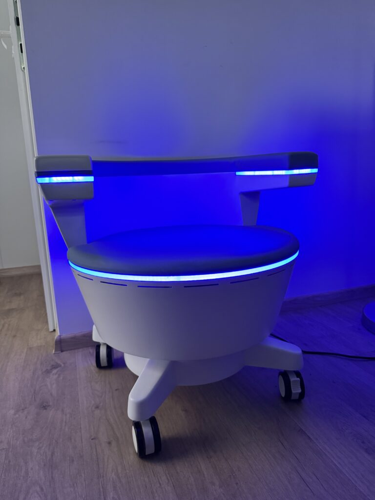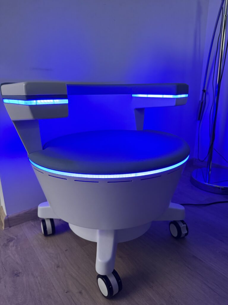 Fotel symulujący mięśnie dna miednicy to nieinwazyjna terapia wzmacniająca mięśnie dna miednicy i okolic odbytu. Pomaga poprawić ich napięcie, krążenie oraz funkcjonowanie, co może wspierać redukcję dolegliwości takich jak uczucie ciężkości, osłabienie mięśni czy nawracające problemy z hemoroidami.